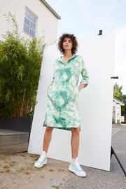 Batikprint in Pastellgrün-Tönen mit beige-grau Tönen im Mix, auf leichter und weich fließender Viskose. Ein perfektes Reise-und Alltagskleid durch den pflegeleichten Stoff, knittert nicht und fällt wunderschön. Easy to wear, easy to care.