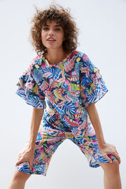 Leichte Sommerbluse aus luftiger Baumwolle in dunkelblau mit auffälligem Floral-Print mit dezenten Design-Details. Der schlicht gehaltene Schnitt und der sehr farbenfrohe Sommer-Print passen perfekt zusammen und als Highlight der gerüschte Ärmel. Ein Must-have für das Frühjahr und den Sommer!
