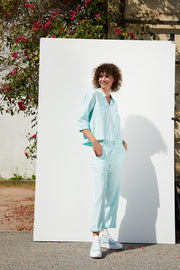 Lässig-elegante Bluse aus leichtem Viskose-Crash in Pastell-Mintfarben. Material und Schnittführung luftig Figur-umspielend bis zu weit, im Rumpf. Die schönen Details: kleine aufgesetzte Taschen, schmaler Stehkragen und im Vorderteil mit Schlitz, mit schmalen Bindebändern. Sehr angezogen und vielseitig zum Kombinieren! Das Material ist cool vom Griff, edel vom Look und herrlich für das Frühjahr und den Sommer!