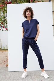 Cooler Jersey mit Stretch in edlem Mitternachtsblau. In der Schnittführung leicht Figur-umspielt und lässig, zum Saum verjüngend, mit einem guten Sitz in der Taille und um die Hüfte. Optimal um das ein oder andere zu Kaschieren! Gemütlichkeit durch breites Bündchen zum Schlüpfen und die Eingrifftaschen. Diese Hose ist ein modisches Must-Have, unglaublich vielfältig zum Kombinieren!