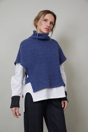 Wärmendes Cape, leicht oversized geschnitten, mit locker fallendem Rolli in grober Strickart aus edlem Wolle-Mix. Trend- Überzieher im Design, zeitlos in der Farbwahl, lässig-elegant, der Blau-Ton lädt vielfältig zum Kombinieren ein! Perfekt über modische weite Ärmel zu ziehen, ob Bluse oder Shirt, Vorder-und Rückenteil sind auf Taillenhöhe mit einem Steg verbunden. Absolutes Lieblingsstück, um viele neue Looks zu kreieren!