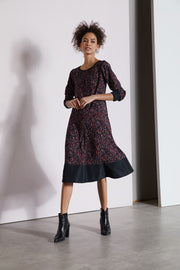 Elegantes und besonderes Design in leichter und weich fließender Viskose mit schönem Print. Ein perfektes Reise-und Alltagskleid durch den pflegeleichten Stoff, knittert nicht und fällt wunderschön. Mit besonderen Detail: aus Taft der Ärmelabschluss und die breite Saumblende! Herrlich weit zum Saum hin ausgestellt, bis zur Taille auf Figur, zaubert dieser Schnitt für jeden Figurtyp eine schöne Silhouette. Anziehen, gut Aussehen und fertig.
