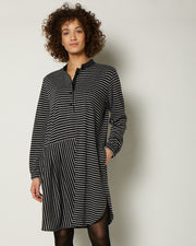 Reinschlüpfen in herrlich leichten Cotton-Strick, on point angezogen sein, gut aussehen und los! Besondere Design-Details -Einsatz im Vorderteil, schwarz abgesetzter Knopfleiste, den Teilungsnähten und dem Gummizug-Tunnel im Ärmelsaum machen dieses lässig luftige Kleid zu einem wahren Hingucker!