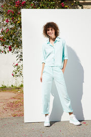 Konfektionierte Hose mit Lässigkeit und Eleganz aus leichtem Viskose-Crash in Pastell-Mintfarben. Optimale Schnittführung mit einem guten Sitz in der Taille und um die Hüfte -und für eine schöne, weibliche Silhouette, ab der Hüfte mit geradem Beinverlauf. Stoff und Schnitt eignen sich zum Krempeln auf 7/8 Länge! Das Material ist cool vom Griff, edel vom Look und herrlich für das Frühjahr und den Sommer!