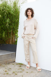 Konfektionierte Hose mit Lässigkeit und Eleganz aus leichtem Viskose-Crash in der Farbe weiß. Optimale Schnittführung mit einem guten Sitz in der Taille und um die Hüfte -und für eine schöne, weibliche Silhouette, ab der Hüfte mit geradem Beinverlauf. Stoff und Schnitt eignen sich zum Krempeln auf 7/8 Länge! Das Material ist cool vom Griff, edel vom Look und herrlich für das Frühjahr und den Sommer! Das neue Lieblingsteil!!!
